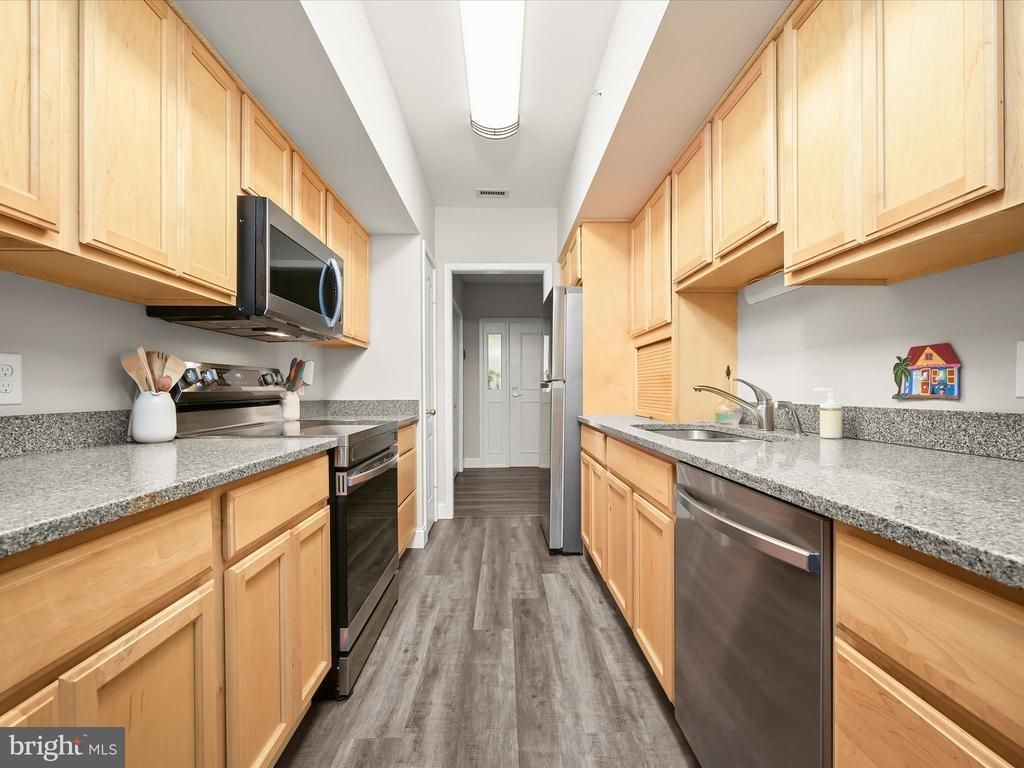 Introducing this spectacular one bedroom, one bathroom first floor garden style condo in the sought-after Watermark Place in the heart of vibrant Columbia. Beautifully manicured grounds welcome you, and inside, the secure lobby includes a doorman. Remodeled in 2023, this inviting unit features a modern neutral color palette with new flooring, stainless steel appliances, water heater, and HVAC system with an Ecobee smart thermostat. Step inside the foyer with a convenient coat closet for storing essentials. The kitchen offers a pantry, granite counters, and an appliance garage, opening to a dining area for everyday meals. The expansive living room showcases elegant crown molding and sliding glass doors leading to a large fenced courtyard with patio and garden, backing to lush greenery for a peaceful setting. Down the hall, the spacious bedroom has a walk-in closet, while the bathroom has both a walk-in shower and separate tub. Completing the unit is a utility closet with full-size stacked washer and dryer. Additional conveniences include a storage locker down the hall, and an assigned parking space in the secure garage with inside access. Residents enjoy amenities with an outdoor pool, fitness center, club room, mail room, and fenced dog park, along with scenic walking paths around Wilde Lake with a fishing pier and playground. Explore Columbia Town Center just moments away with a wide variety of excellent shopping, dining, entertainment options with The Mall in Columbia, Merriweather District, Lake Kittamaqundi Waterfront, Merriweather Post Pavilion, and so much more, with quick access to Routes 29 and 175.